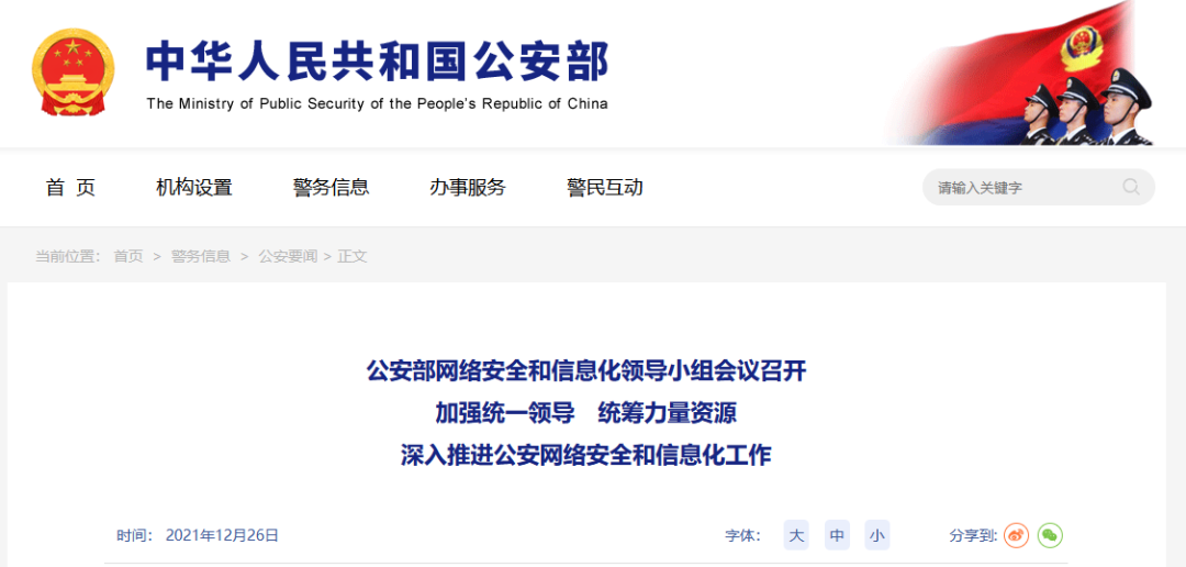 12月25日,公安部網(wǎng)絡(luò)安全和信息化領(lǐng)導(dǎo)小組會(huì)議召開。國(guó)務(wù)委員、公安部部長(zhǎng)、部網(wǎng)絡(luò)安全和信息化領(lǐng)導(dǎo)小組組長(zhǎng)趙克志主持會(huì)議并發(fā)表講話。會(huì)議強(qiáng)調(diào),要深入貫徹落實(shí)習(xí)近平總書記關(guān)于網(wǎng)絡(luò)安全和信息化工作的重要指示精神,增強(qiáng)“四個(gè)意識(shí)”、堅(jiān)定“四個(gè)自信”、做到“兩個(gè)維護(hù)”,加強(qiáng)統(tǒng)一領(lǐng)導(dǎo),統(tǒng)籌力量資源,進(jìn)一步推進(jìn)公安網(wǎng)絡(luò)安全和信息化工作,更好履行新時(shí)代黨和人民賦予的職責(zé)使命。